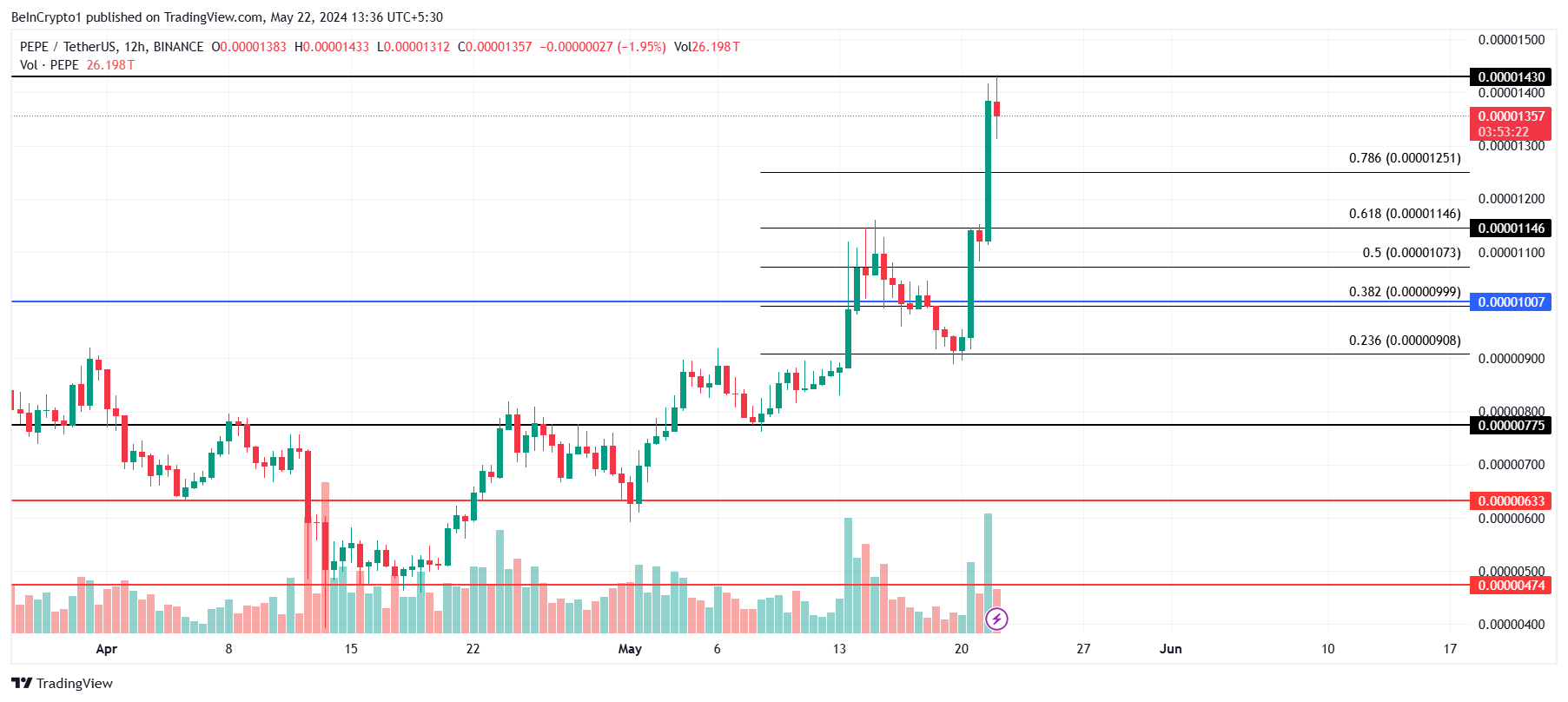 Il prezzo di PEPE arriva a di $0.00001430 dopo essere salito del 51% negli ultimi due giorni. Al momento in cui scriviamo, l’altcoin non mostra alcun segno di declino, ma considerando gli indicatori di cui sopra, potrebbe verificarsi presto.
