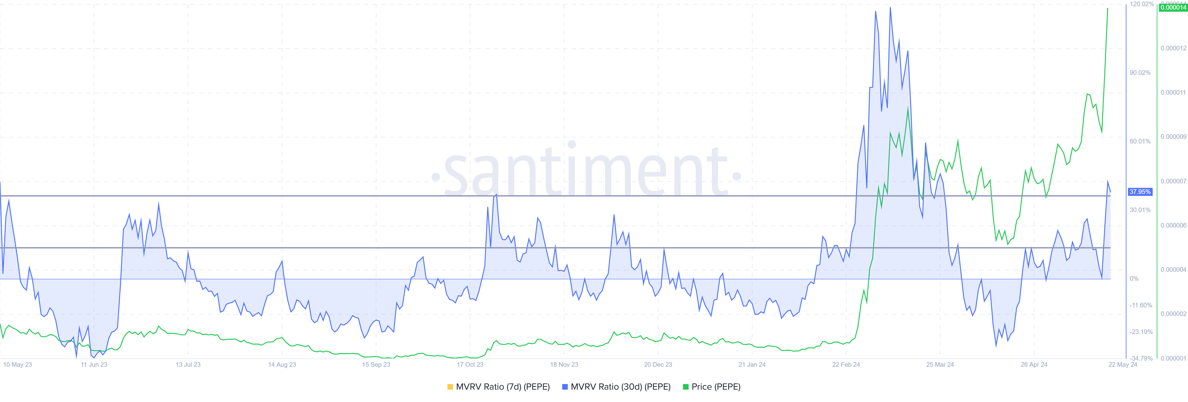 Storicamente, la meme coin ha subito correzioni a livelli di MVRV dal 15% al 36%, contrassegnandola come zona di pericolo. PEPE è già al di sopra di questo livello, il che significa un maggiore potenziale di presa di profitto.