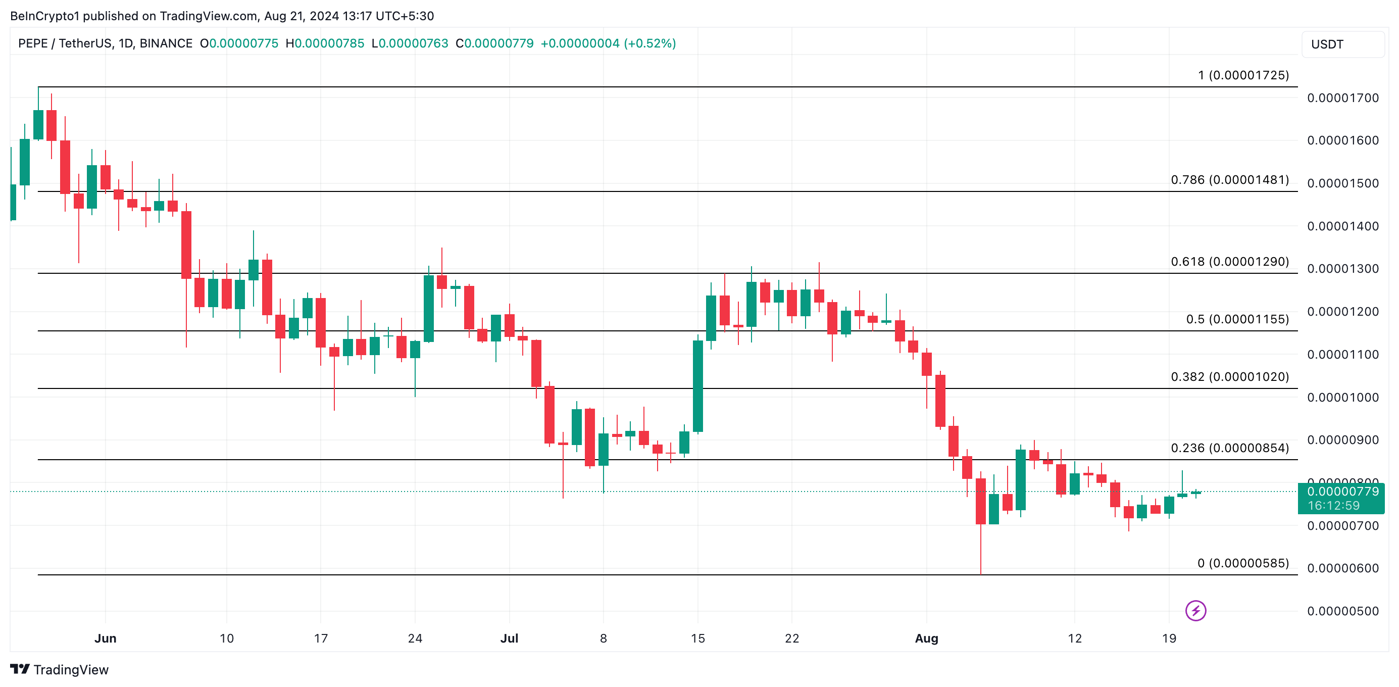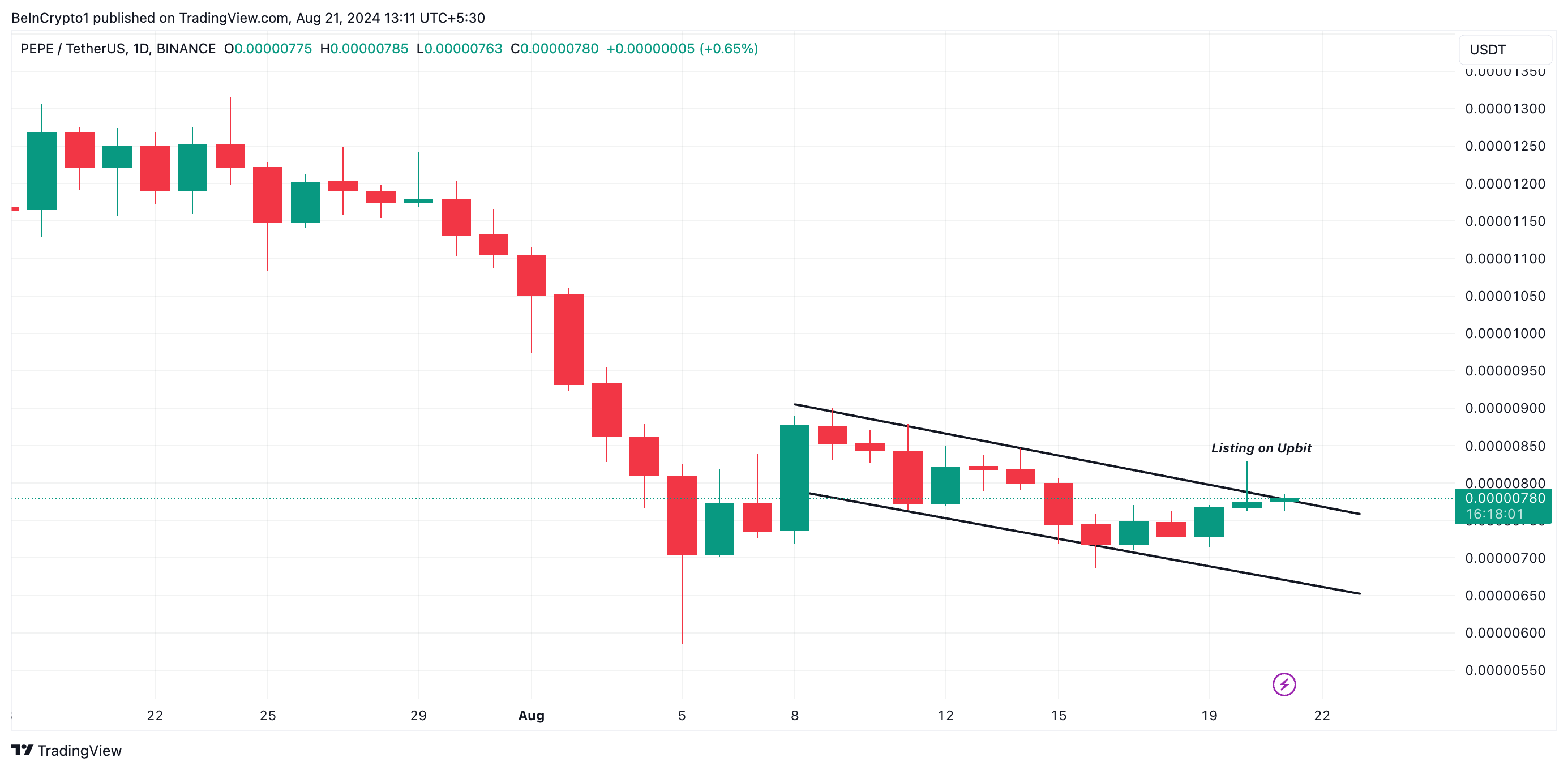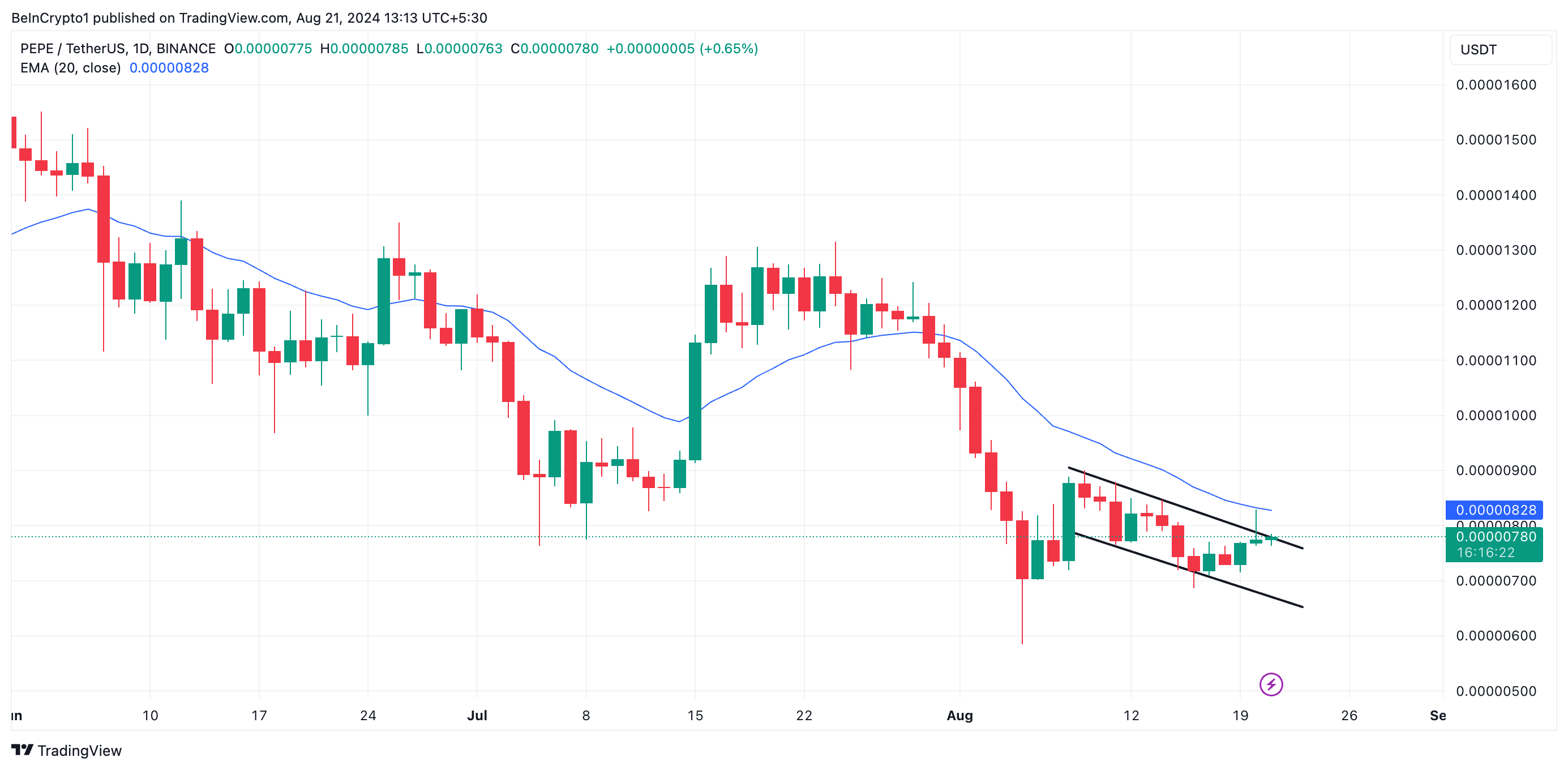 Dopo il declino generale del mercato del 5 agosto, PEPE si è trovata in una tendenza al ribasso che ha portato alla formazione di un canale discendente. Questo modello ribassista appare quando il prezzo di un asset si muove costantemente verso il basso, creando una serie di massimi e minimi inferiori.