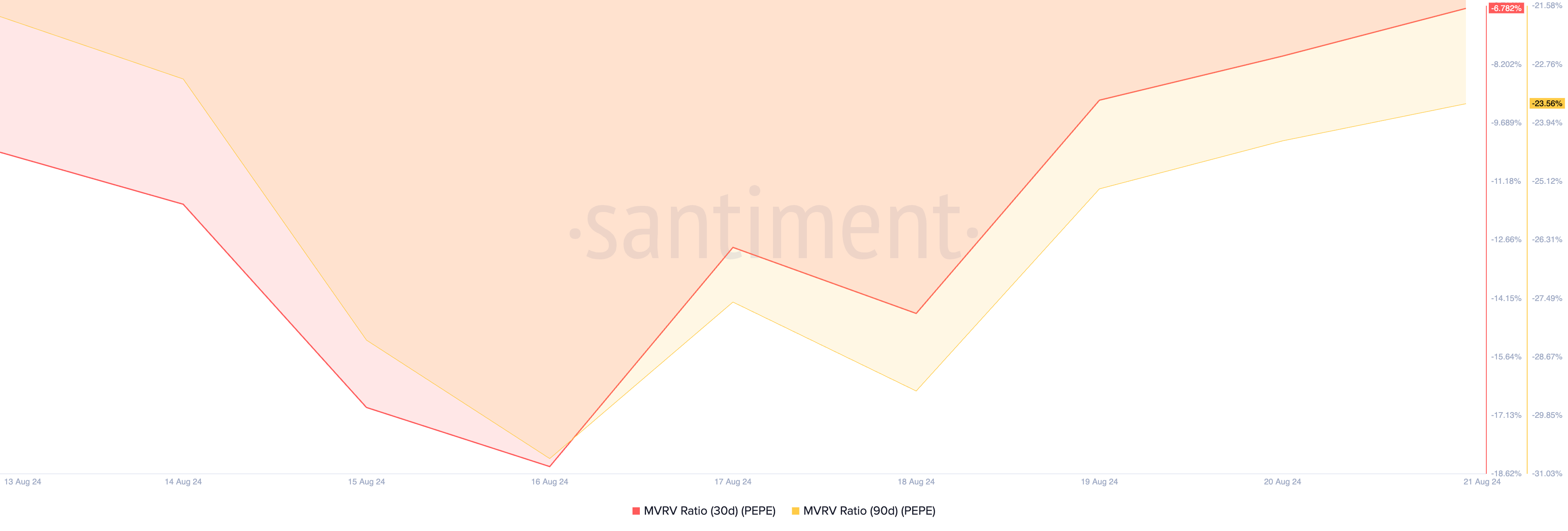 I dati sul blockchain suggeriscono che PEPE rimane sottovalutato e potrebbe essere un buon acquisto per chi cerca di guadagnare dal potenziale rialzo. Ciò si basa sulla valutazione del rapporto tra valore di mercato e valore realizzato (MVRV) del token rispetto a diverse medie mobili.
