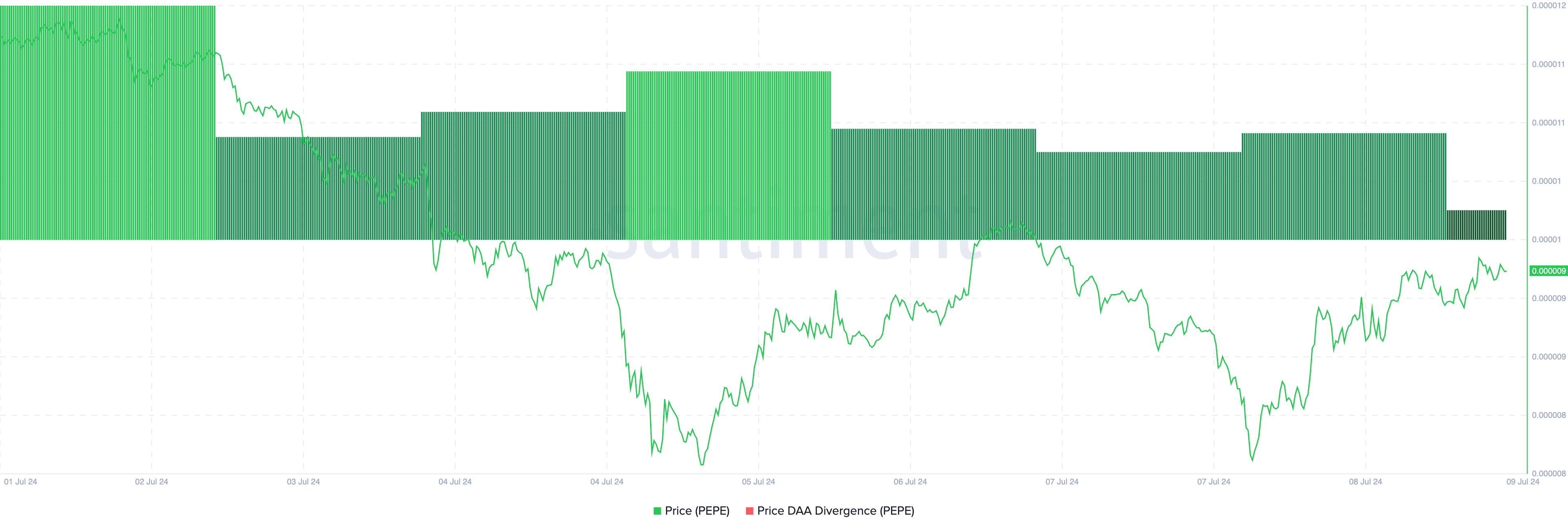 Ciò si è verificato in quanto il rialzo del prezzo di PEPE nelle ultime 24 ore è stato sostenuto da una sostanziale domanda di memecoin, in base alle letture della sua divergenza prezzo-indirizzo attivo giornaliero (DAA).