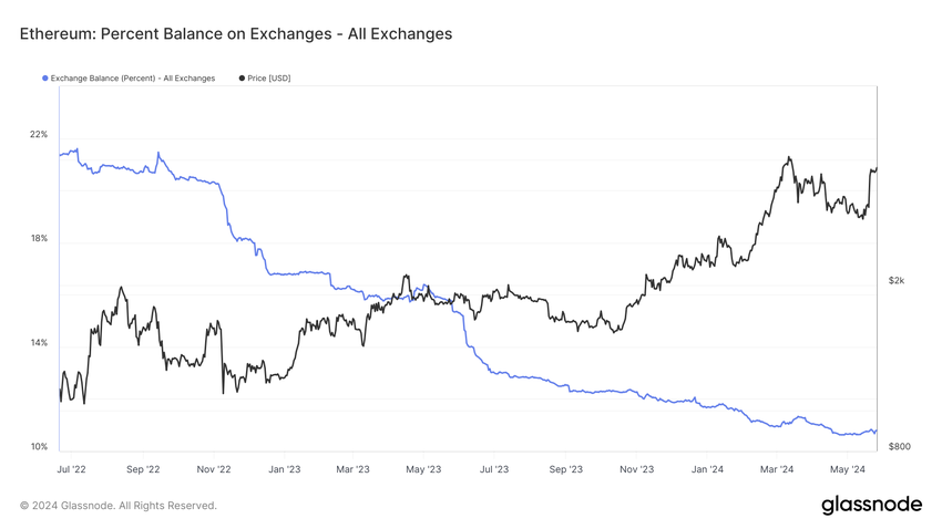 La percentuale di Ethereum detenuti sugli exchange è diminuita drasticamente fino a scendere al di sotto dell’11% entro maggio 2024. Questa tendenza indica uno spostamento significativo verso lo stoccaggio e lo staking a lungo termine, riducendo l’offerta immediata disponibile per il trading e la pressione di vendita.