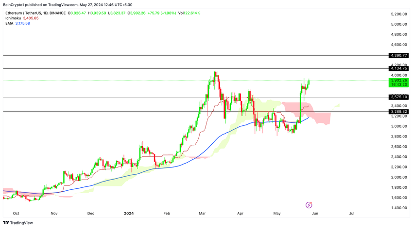• Ethereum viene scambiato a 3.902$ con slancio rialzista, ben al di sopra della nuvola di Ichimoku e dell'EMA a 100 giorni a 3.175$.