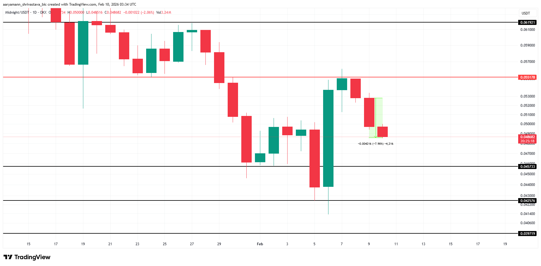 NIGHT è scesa dell’8% nelle ultime 24 ore, scambiando vicino a $0,0486 al momento della pubblicazione. Il ritracciamento riflette un momentum in calo dopo un rally del weekend non riuscito. La debolezza del prezzo suggerisce che i venditori hanno riconquistato il controllo a breve termine, mentre i trader rivalutano il rischio in un contesto di condizioni generali del mercato irregolari.