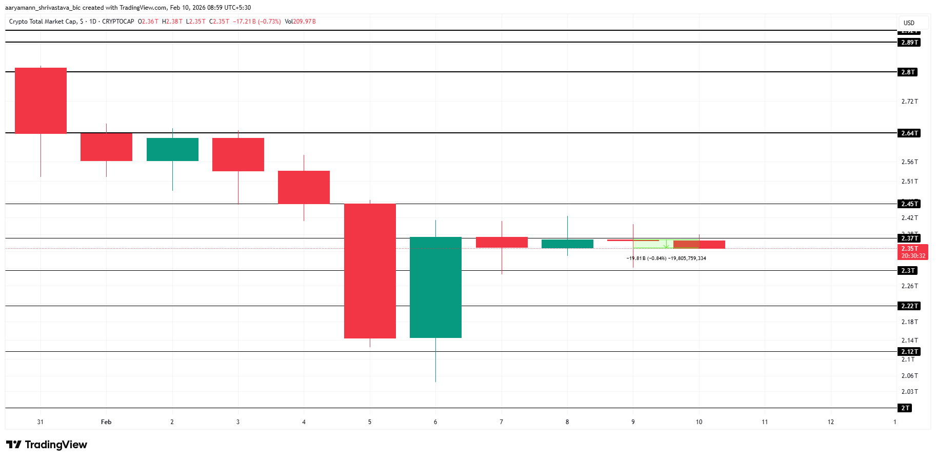 Il potenziale rialzista rimane intatto se il comportamento degli investitori dovesse cambiare. Un movimento deciso oltre la resistenza dei 2.370 miliardi di dollari confermerebbe momentum rialzista. In tale scenario, TOTAL potrebbe avanzare verso i 2.450 miliardi di dollari. Afflussi sostenuti e un sentiment in miglioramento potrebbero estendere i guadagni, puntando al livello dei 2.640 miliardi di dollari.