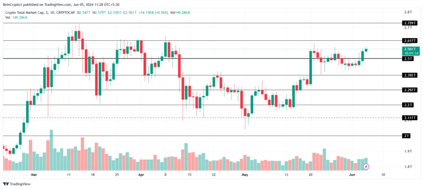 Dopo giorni di oscillazione intorno a questo punto di prezzo, il tetto totale del mercato delle criptovalute ha superato la resistenza chiave di 2,50 trilioni di dollari. TOTAL è ora più vicino a superare la resistenza segnata a 2,61 trilioni di dollari.