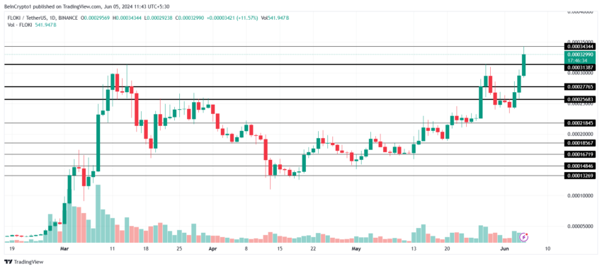 FLOKI è emerso come l’asset più performante nelle ultime 24 ore, con un aumento di quasi il 22%. La moneta meme ha raggiunto un nuovo massimo storico di 0,0003434 dollari, invalidando il precedente ATH di 0,0003138 dollari.
