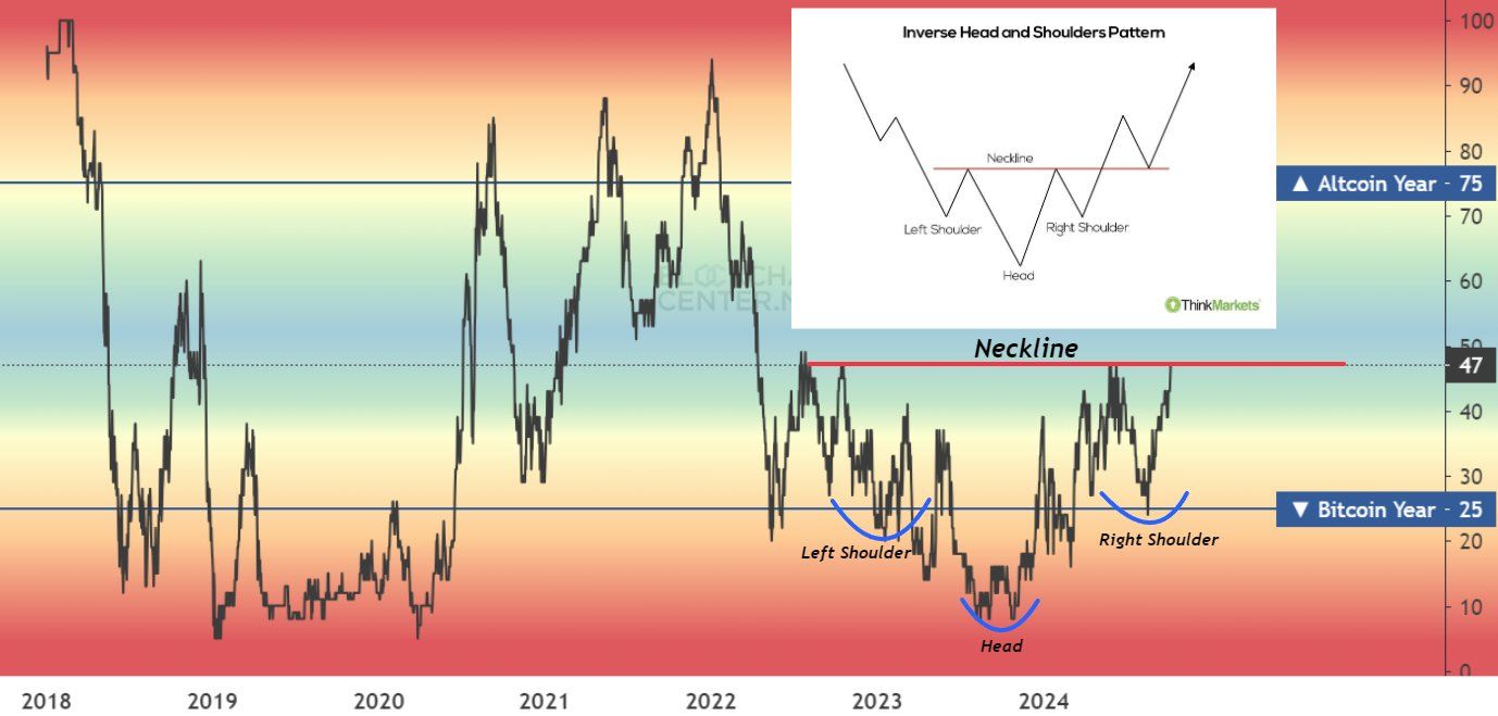 In un post dell’11 ottobre su X, l’analista pseudonimo Moustache ha notato che l’Indice della Stagione delle Altcoin ha formato uno dei modelli più rialzisti degli ultimi 3,5 anni: l’Inverse Head and Shoulders.