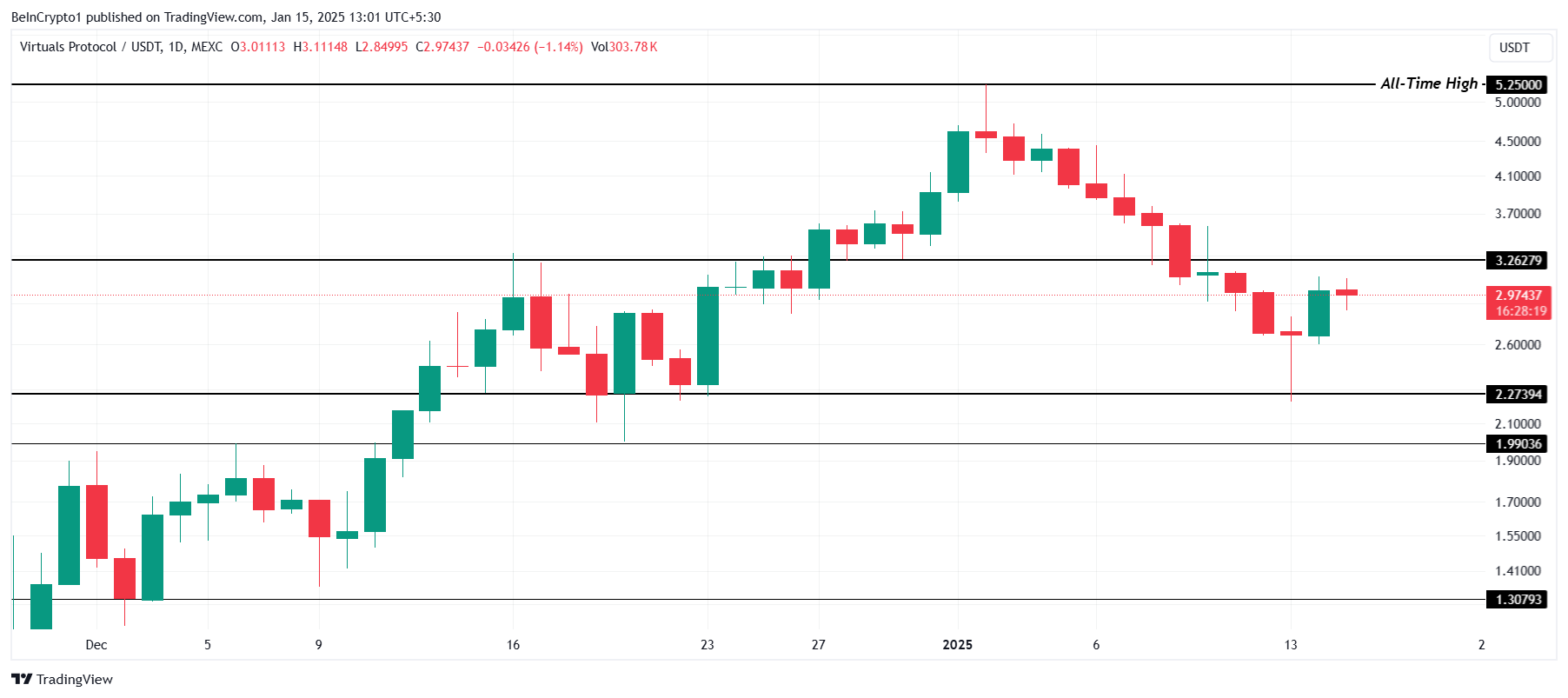 Il Protocollo Virtuals ha attirato l’attenzione grazie al recente successo del suo token AI Agent, AIXBT, che ha raggiunto un nuovo massimo storico. Se questo sentimento rialzista passivo persiste, VIRTUAL potrebbe riconquistare il livello di supporto critico di 3.26 USD, preparando il terreno per un ulteriore recupero del prezzo.