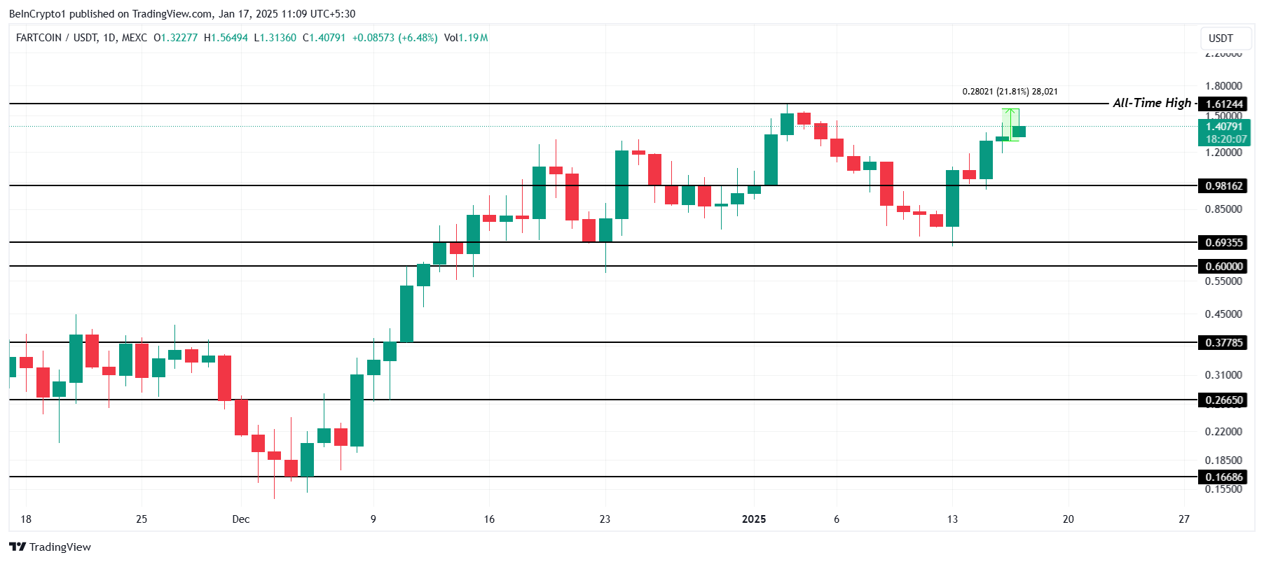 FARTCOIN ha guadagnato attenzione oggi per il suo significativo rally. L’intra-day high del memecoin lo ha avvicinato al suo massimo storico di 1.61 USD, anche se non è riuscito a superare o testare questo livello. Questo aumento evidenzia il suo potenziale per ulteriori guadagni se lo slancio rimane costante.