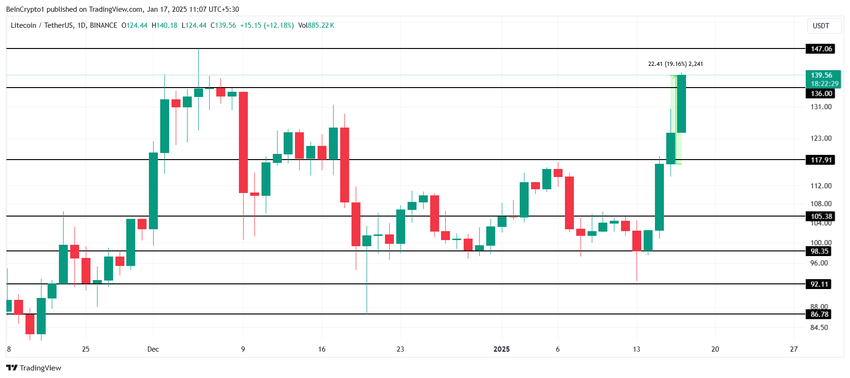 Dopo questa notizia, il prezzo di Litecoin è aumentato del 19%, raggiungendo 139 USD al momento della scrittura. Questo rally ha permesso a LTC di superare la barriera critica di 136 USD. Il prossimo obiettivo per Litecoin è trasformare 147 USD in un livello di supporto, potenzialmente aprendo la strada a un aumento fino a 150 USD e oltre.
