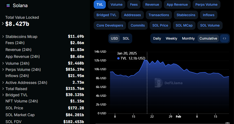 Intanto, il crollo di LIBRA ha avuto implicazioni più ampie che vanno oltre il token stesso. Lo scompiglio sulla memecoin ha coinciso con un calo del 16% del prezzo di Solana e un deflusso di liquidità dai progetti basati su Solana verso Ethereum. DeFiLlama riporta un calo da $12,1 miliardi a $8,42 miliardi in liquidità al momento della stesura di questo articolo.