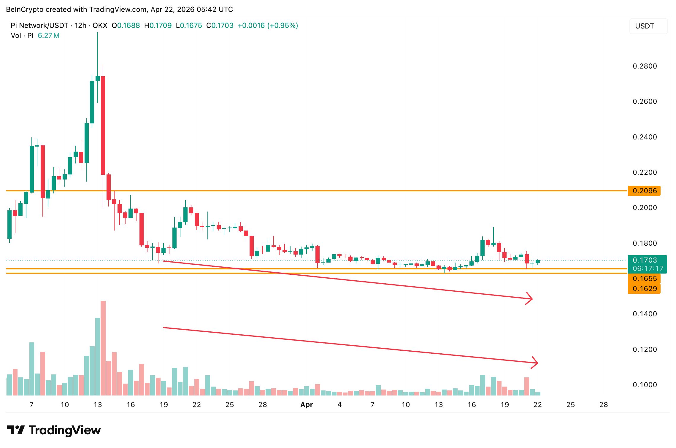Il prezzo di Pi Coin (PI) è scambiato a $0,170, in rialzo nella giornata ma ancora ingabbiato tra la resistenza a $0,209 e il supporto a $0,162 dal metà marzo.