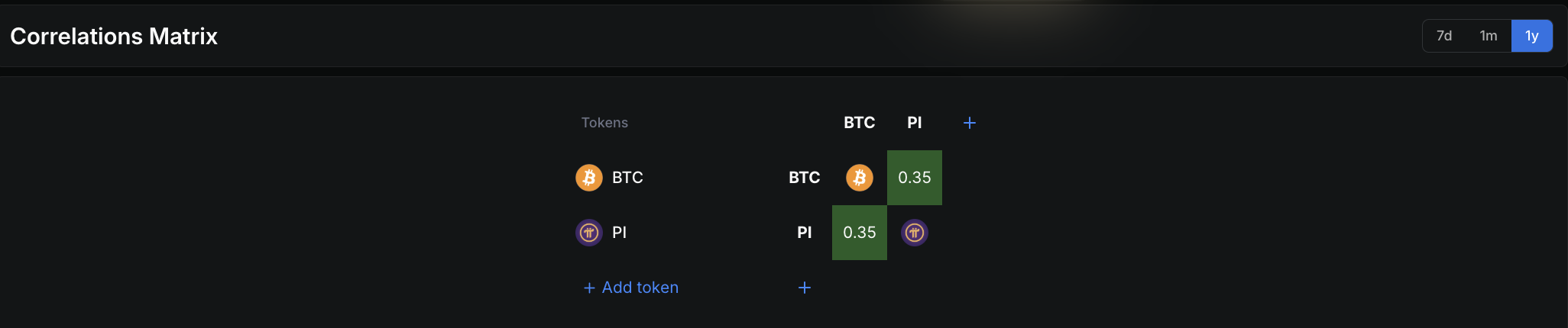 La disconnessione emerge chiaramente dai numeri. La correlazione di Pearson su base annua tra Pi Coin e Bitcoin è pari a 0,35. Il coefficiente di correlazione di Pearson misura quanto due asset si muovano insieme su una scala da -1 a 1, dove 1,0 rappresenta una relazione positiva perfetta e 0 nessuna relazione.