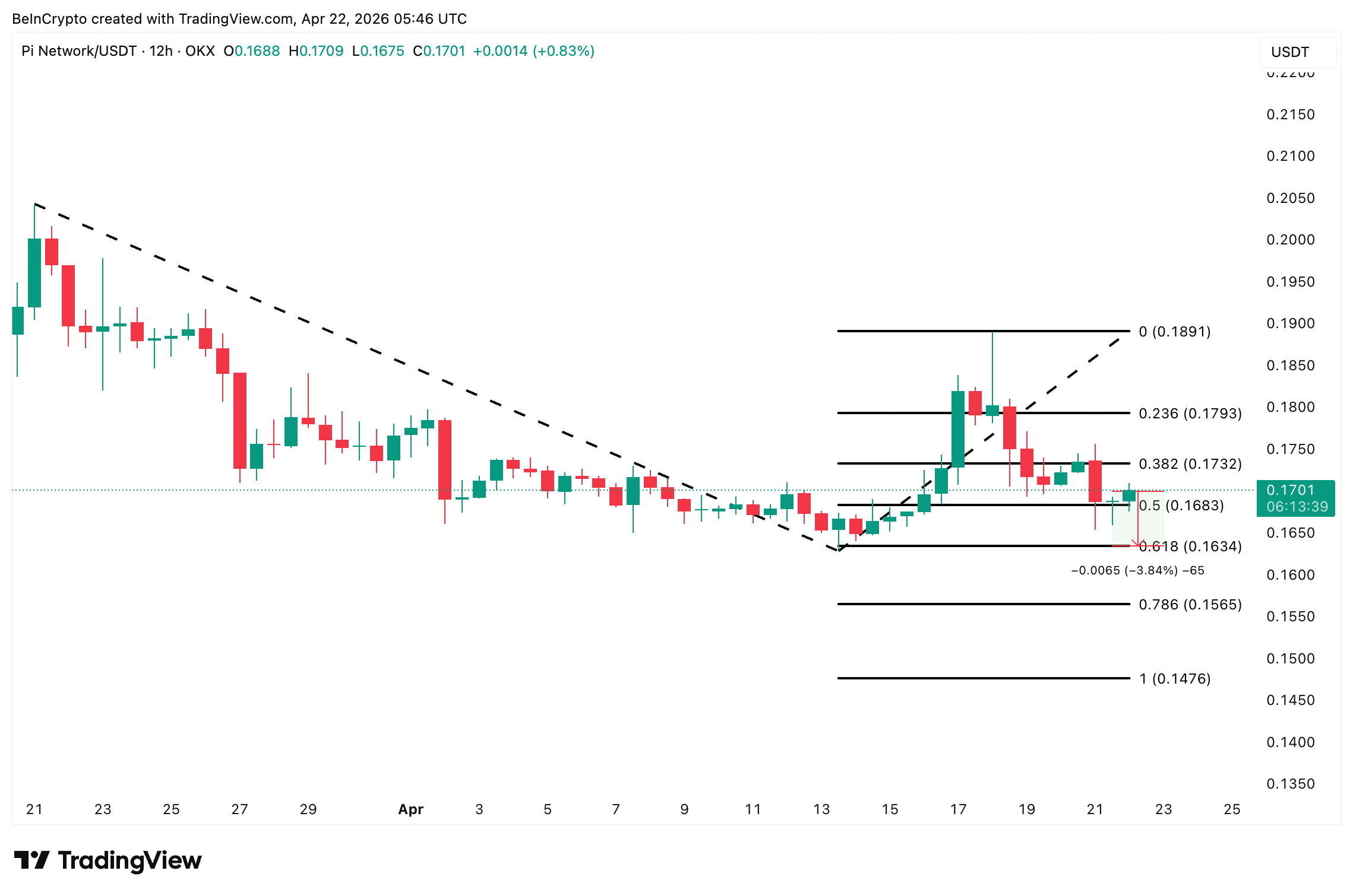 Al ribasso, la configurazione diventerebbe chiaramente ribassista se il livello di $0,168 non dovesse reggere. Il livello di Fibonacci 0,618 a $0,163 si trova poco più sotto, in linea con il limite inferiore dell’intervallo che contiene Pi Coin dalla metà di marzo. Una rottura al di sotto del pavimento di questo range aprirebbe la strada a $0,156 (livello 0,786) e esporrebbe il livello di $0,147.