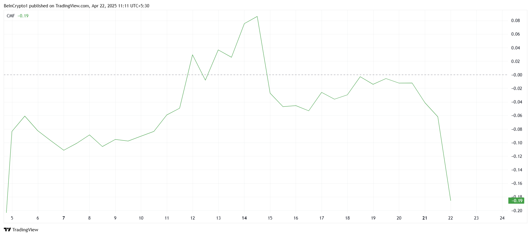 L’indicatore Chaikin Money Flow (CMF) ha mostrato un netto calo negli ultimi giorni, segnalando che l’interesse degli investitori per Pi Network sta diminuendo. Questo sentimento negativo si riflette nella sostanziale quantità di denaro che viene ritirata da PI.