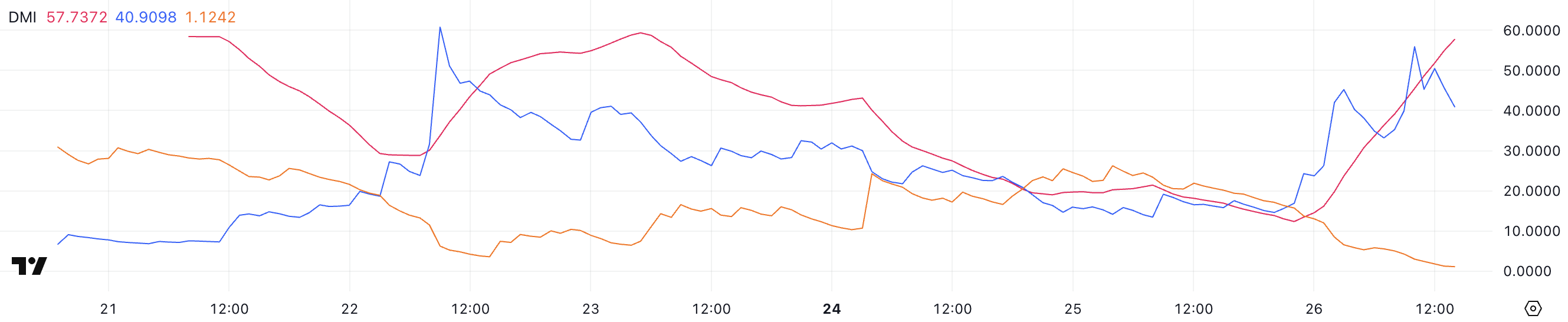 Il Directional Movement Index (DMI) di Pi Network sta mostrando un notevole momentum, con il suo Average Directional Index (ADX) che è salito a 57,7 da appena 12,3 un giorno fa.