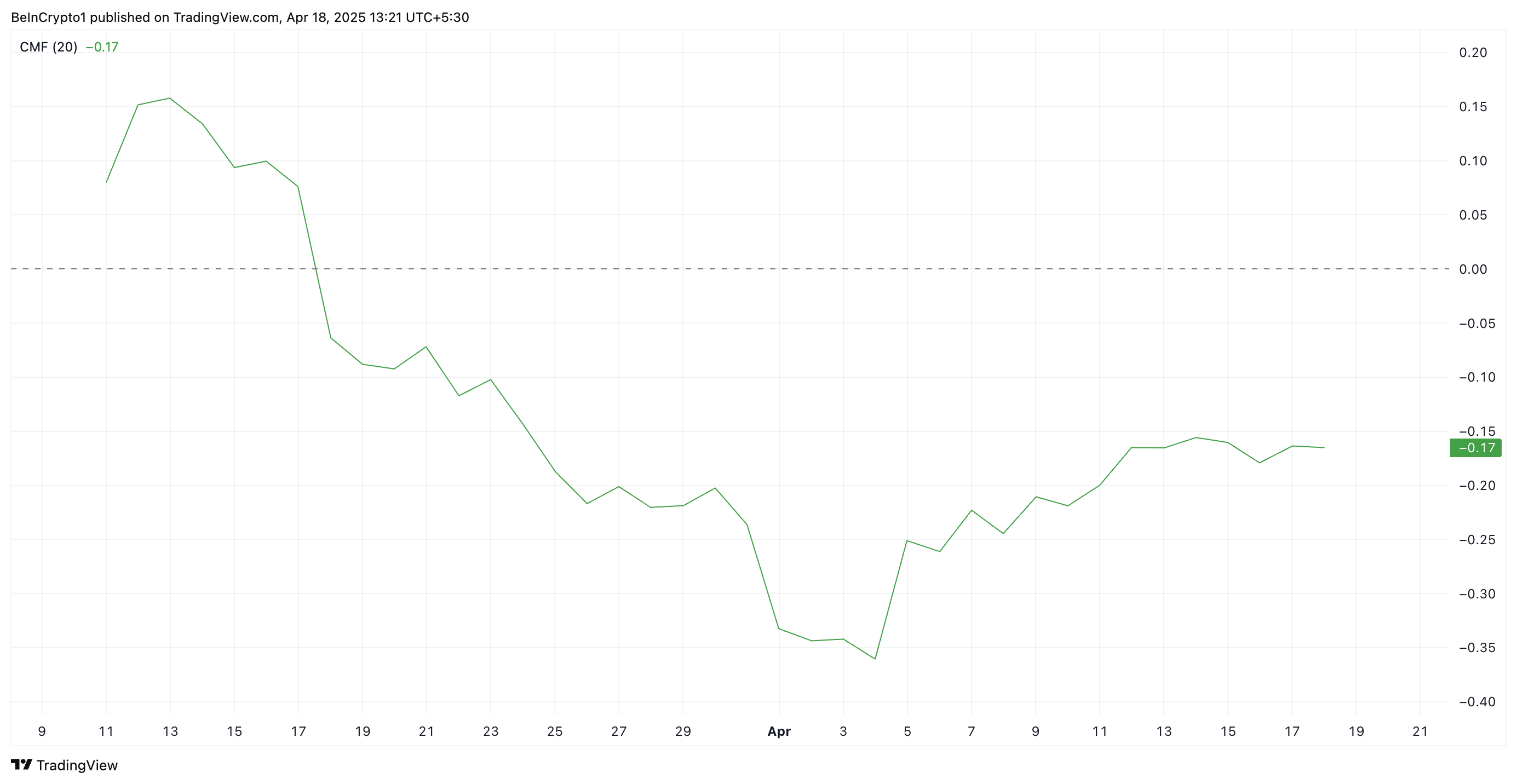 Inoltre, il Chaikin Money Flow (CMF) di PI rimane saldamente sotto la linea centrale, e si trova in questa posizione da quando il suo declino del prezzo è iniziato il 26 febbraio. Questo indicatore di momentum attualmente si attesta a -0,17.