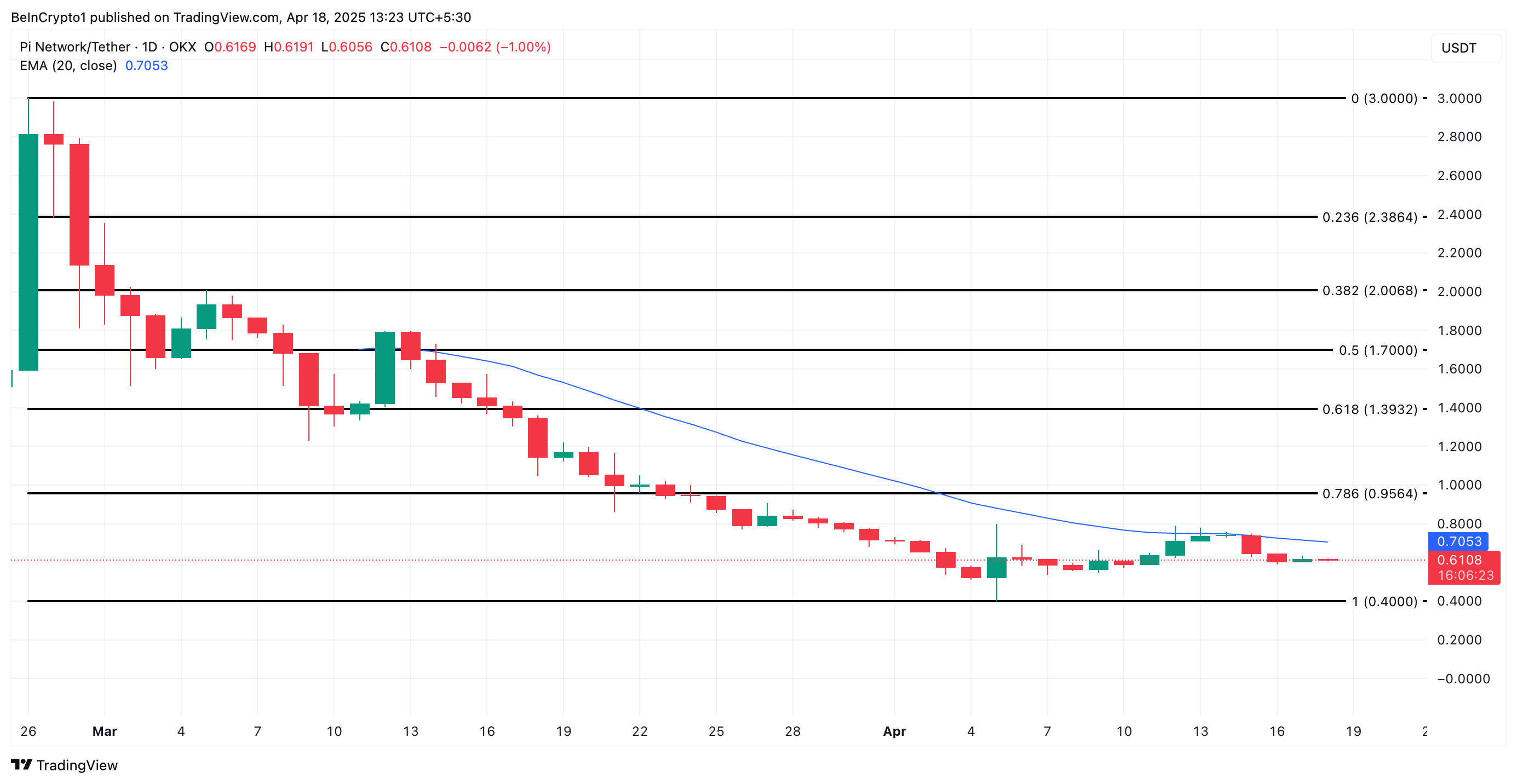 PI attualmente viene scambiato al di sotto della sua media mobile esponenziale a 20 giorni, che forma una resistenza dinamica sopra il suo prezzo a $0,70.