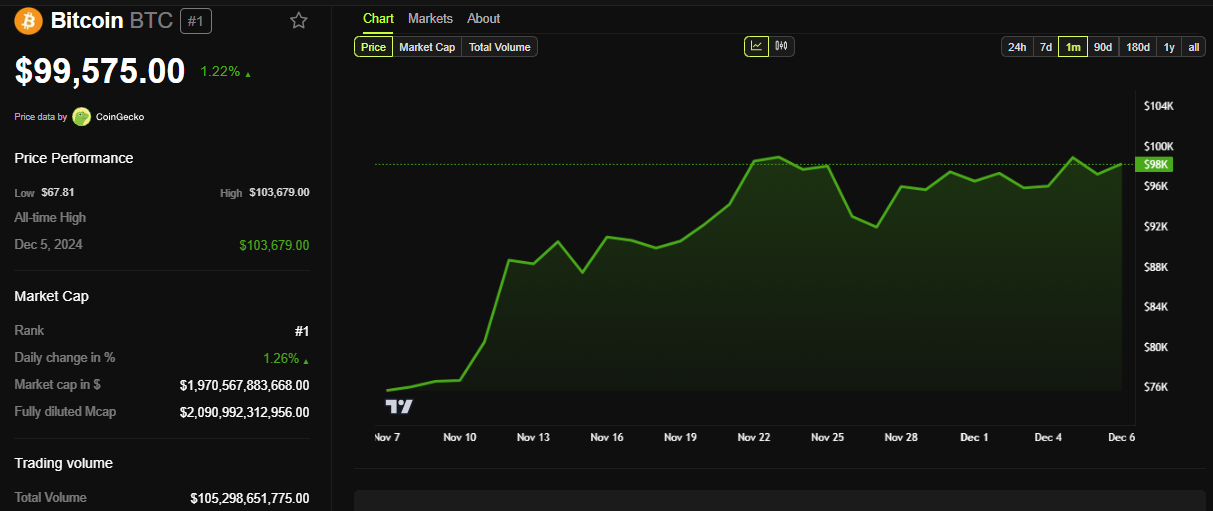 Secondo i dati di BeInCrypto, BTC è scambiato a 99.575 USD, un modesto guadagno dell’1.22% nelle ultime 24 ore.