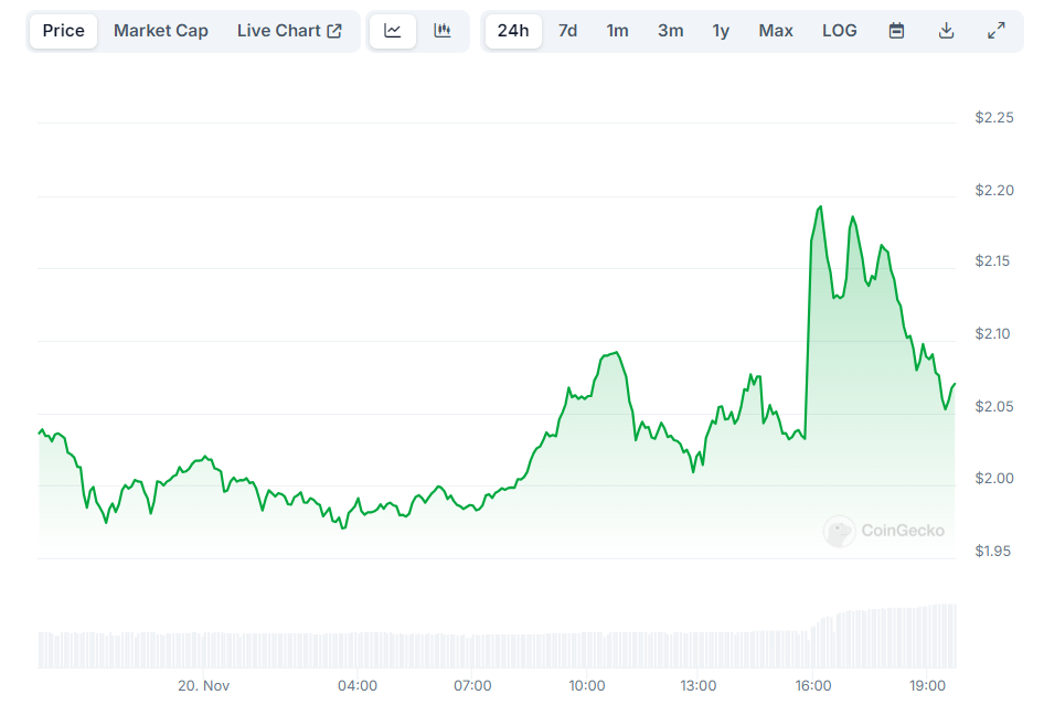 Dopo l’annuncio, il token nativo ARKM di Arkham ha registrato un aumento del prezzo del 7% prima di vedere correzioni. Al momento della segnalazione, il token è scambiato a circa 2,09 USD.