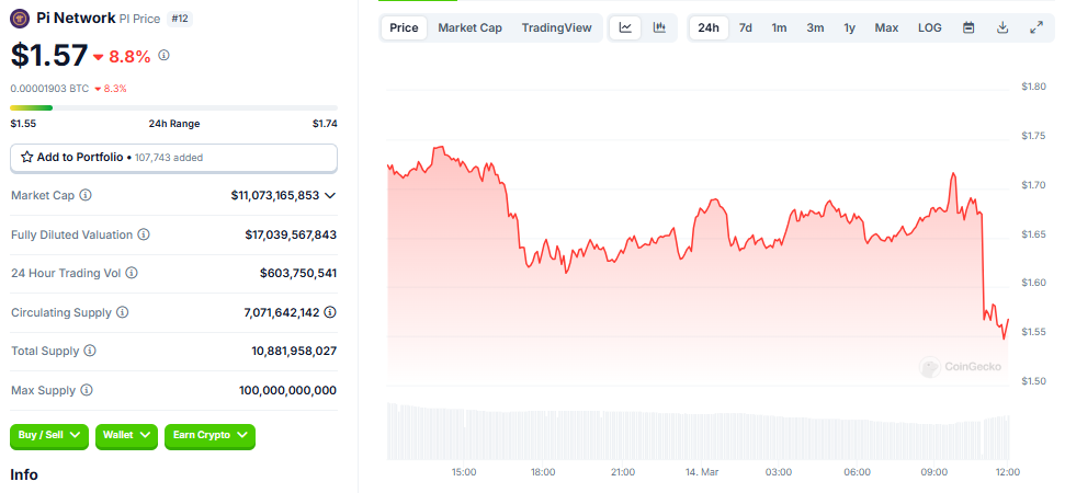 I dati su CoinGecko mostrano che il prezzo di PI di Pi Network era di $1,57 al momento della scrittura, in calo di quasi il 9% nelle ultime 24 ore.