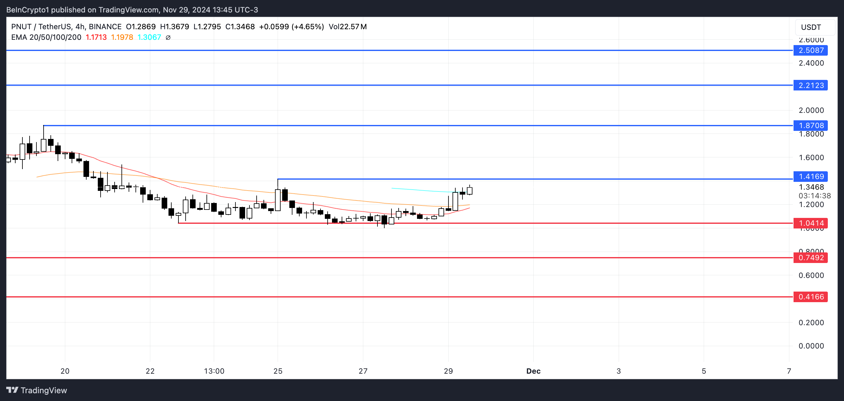 Se il trend rialzista si rafforza, PNUT potrebbe testare 1,87 USD e persino 2,50 USD, sfidando la posizione di POPCAT nelle classifiche. Tuttavia, una perdita di slancio potrebbe portare PNUT a significative correzioni, testando livelli di supporto fino a 0,41 USD.