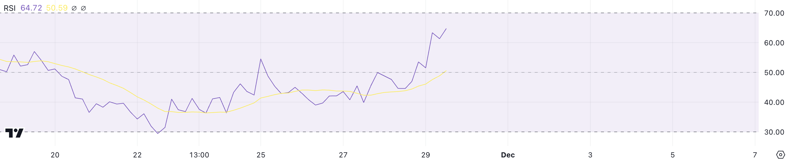 L’RSI di PNUT è attualmente a 64,7, salendo significativamente da sotto 50 solo un giorno fa, indicando un rafforzamento dello slancio rialzista. L’RSI, o Relative Strength Index, misura la velocità e la magnitudine dei cambiamenti di prezzo su una scala da 0 a 100.