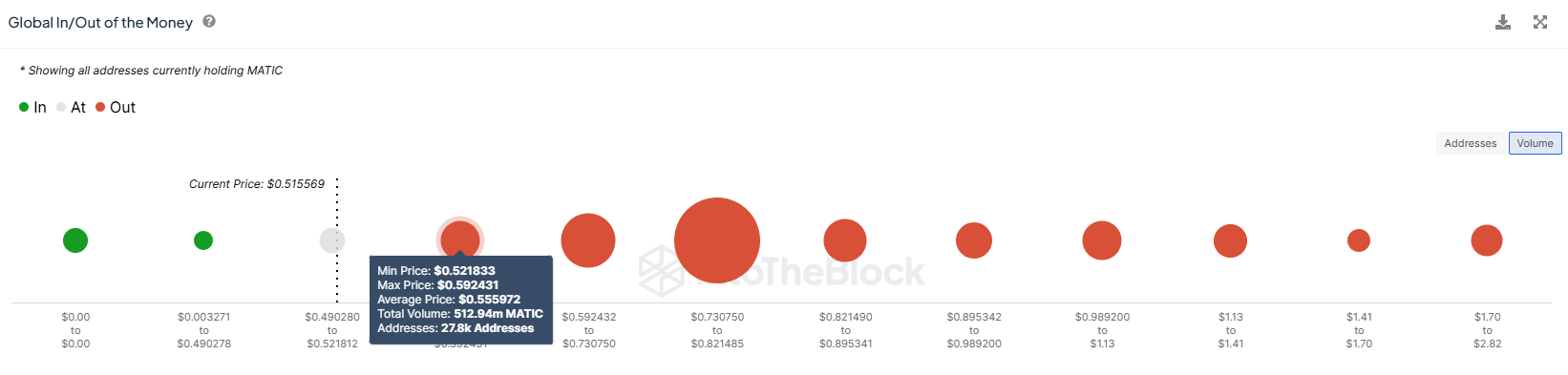Ilprezzo di MATIC, pari a 0,51 dollari, non è riuscito a superare una barriera chiave che potrebbe far lievitare notevolmente i profitti. Secondo l’indicatore Global In/Out of the Money (GIOM), circa 512 milioni di MATIC, per un valore di oltre 264 milioni di dollari, potrebbero presto ribassare i profitti.