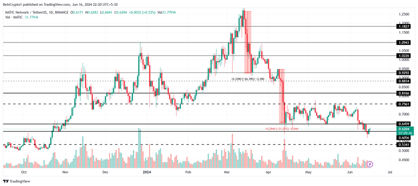 Il prezzo di MATIC ha rotto al di sotto del consolidamento tra 0,75 e 0,64 dollari negli ultimi dieci giorni. Di conseguenza, l’altcoin può essere vista passare di mano a 0,62 dollari al momento della scrittura. Nonostante la presenza di candele verdi negli ultimi due giorni, il token nativo di Polygon è destinato a un calo.