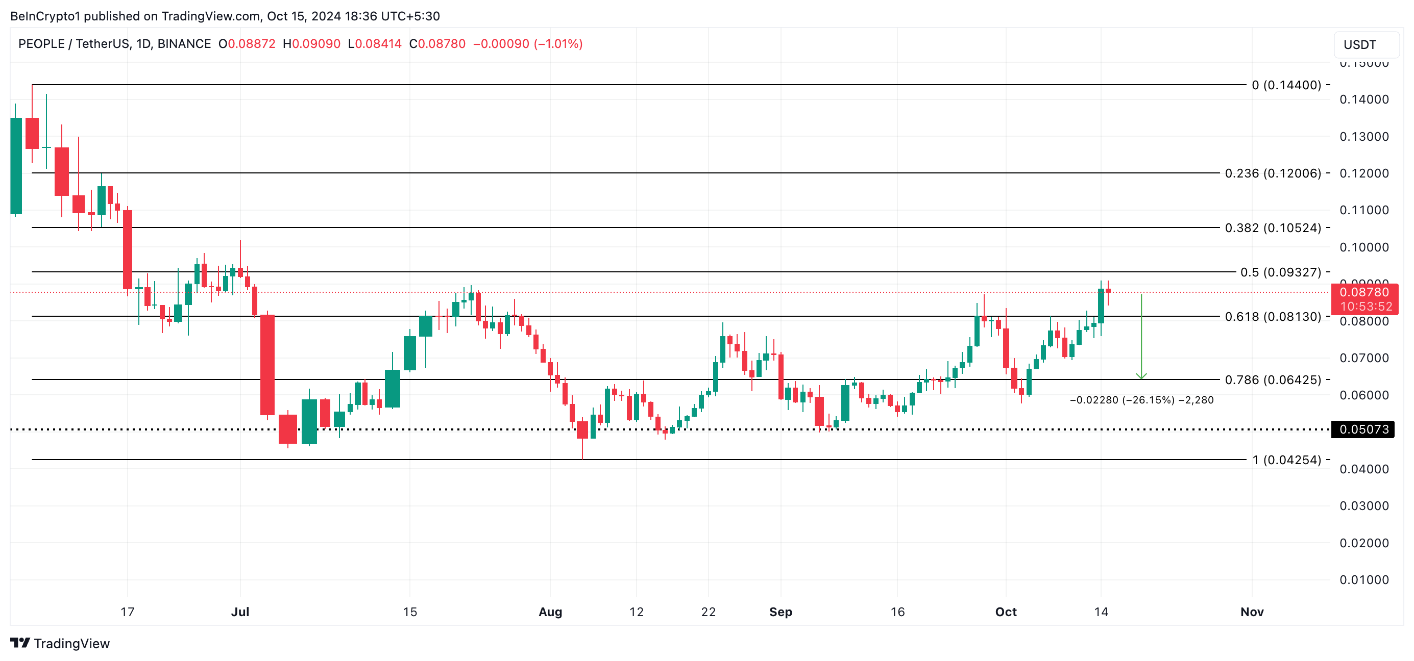PEOPLE attualmente si scambia a 0,08 USD, registrando un calo del 2% nelle ultime 24 ore. Durante questo periodo, il suo volume di scambio è aumentato del 17%. Un calo del prezzo accompagnato da un aumento del volume di scambio suggerisce che molti trader stanno vendendo l’asset, creando pressione al ribasso.