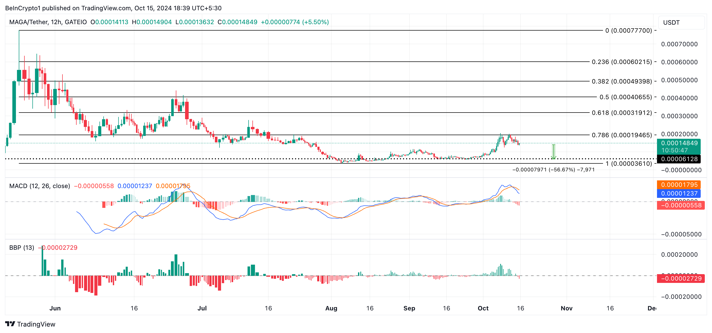 MAGA è un’altra importante moneta PolitiFi il cui valore è crollato nelle ultime 24 ore. Il memecoin attualmente si scambia a 0,00014 USD, registrando un calo del prezzo del 10% nel periodo in esame. La sua configurazione tecnica, valutata su un grafico di 12 ore, conferma il calo dell’accumulo.