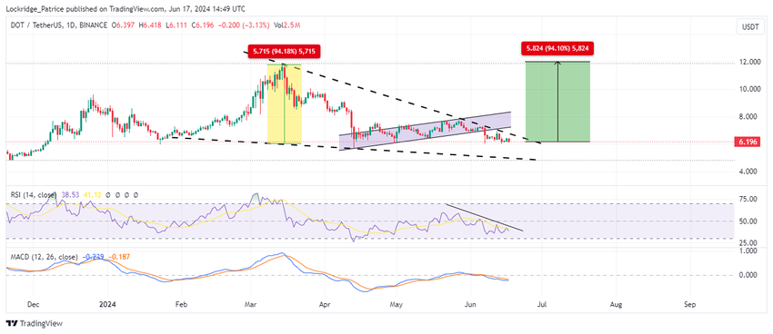 I trader determinano l’obiettivo di profitto di un falling wedge sommando la distanza massima tra le linee di tendenza superiore e inferiore al punto di breakout. Nella coppia di trading DOT/USDT, si tratta di un’ascesa del 94% verso la soglia dei 12 dollari, area testata per l’ultima volta intorno alla metà di marzo.