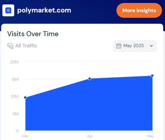 Mentre il traffico verso la maggior parte degli exchange di criptovalute è diminuito, il traffico di Polymarket è aumentato del 50%, passando da 10 milioni di visite a marzo a oltre 15 milioni a maggio.