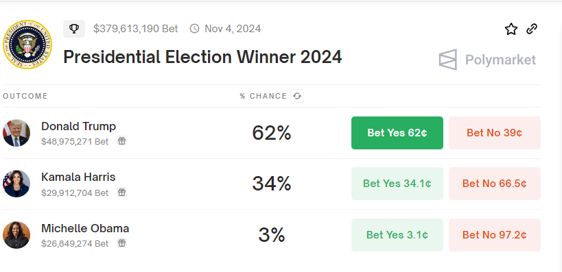 Al momento in cui scriviamo, il candidato repubblicano Donald Trump è in testa con il 62% di probabilità di successo. Al contrario, la candidata democratica Kamala Harris si attesta al 34%, mentre l’ex first lady statunitense Michelle Obama ha il 3% di probabilità.