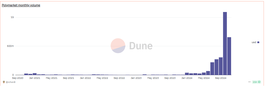 Il successo di Polymarket è evidente nei suoi volumi di trading. Secondo i dati di Dune Analytics, ottobre ha visto un volume record di oltre 1 miliardo di USD in scambi, mentre i primi dieci giorni di novembre hanno aggiunto altri 657 milioni di USD. Anche gli utenti attivi giornalieri hanno raggiunto livelli senza precedenti durante il periodo elettorale.