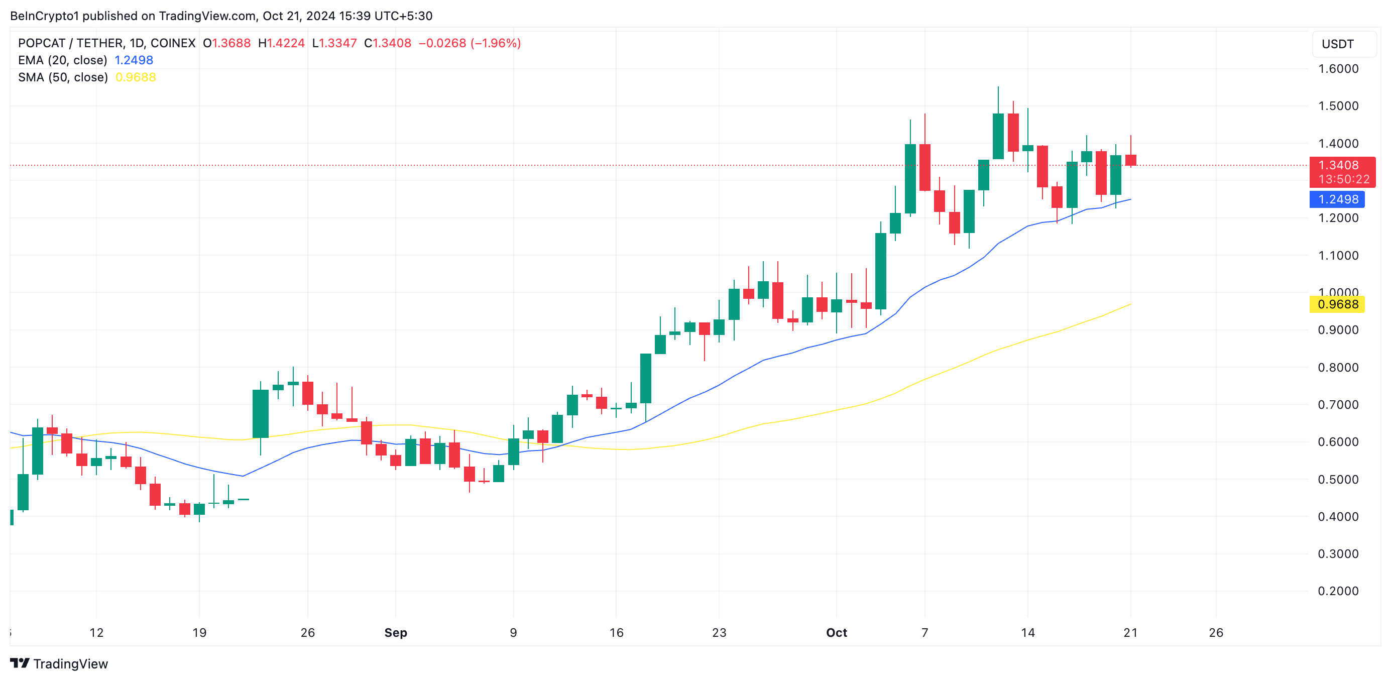 Il recente aumento di POPCAT ha spinto il suo prezzo sopra sia la media mobile esponenziale a 20 giorni (EMA) che la media mobile semplice a 50 giorni (SMA).