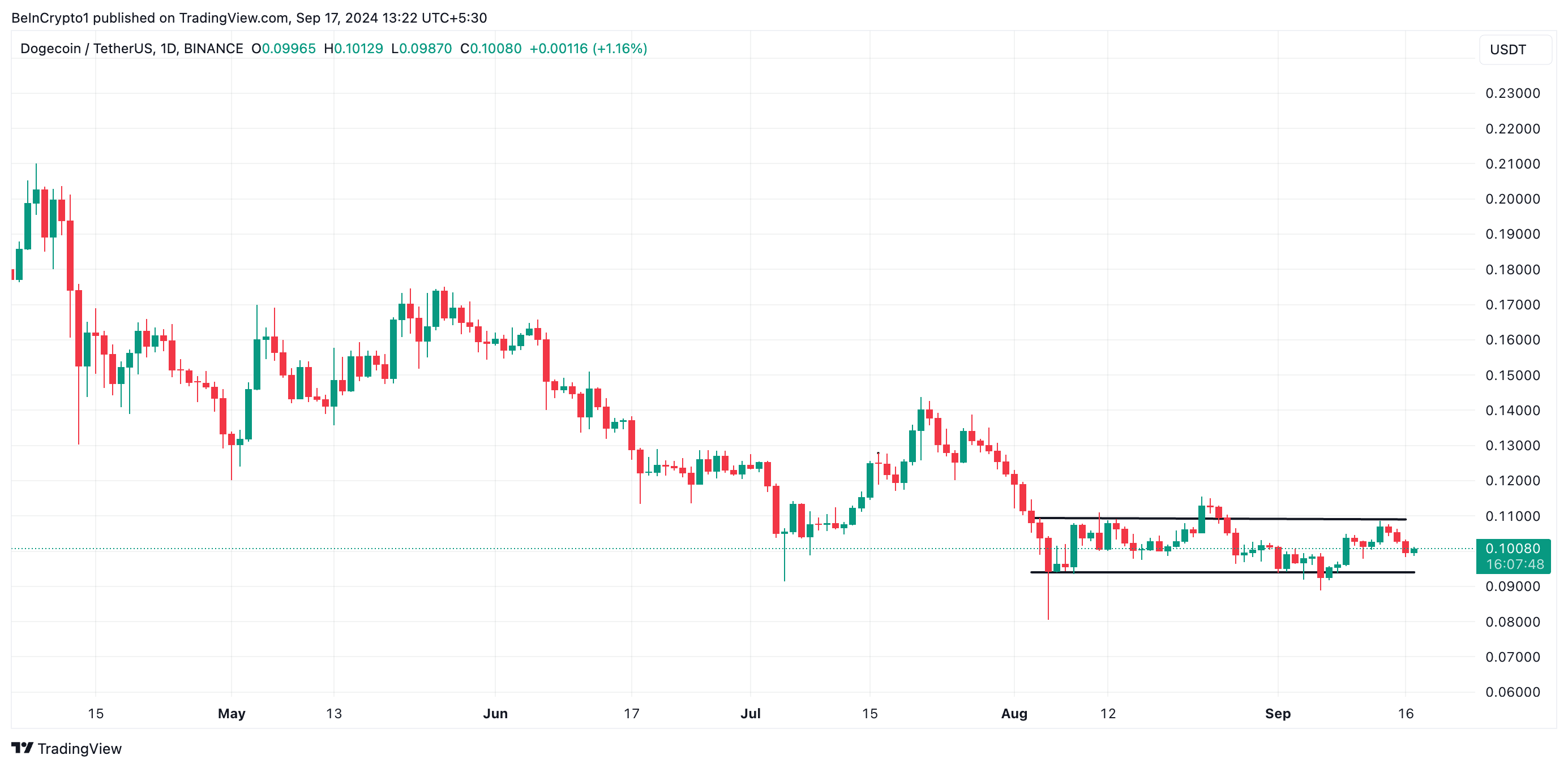 Il tentativo di DOGE di rompere il limite inferiore del suo canale orizzontale aumenta il rischio di ulteriori cali di prezzo. Se i tori non difendono questo livello di supporto, potrebbe confermare una tendenza al ribasso. In tal caso, il prezzo di DOGE potrebbe scendere ulteriormente, raggiungendo il minimo del 5 agosto di 0,08 USD.