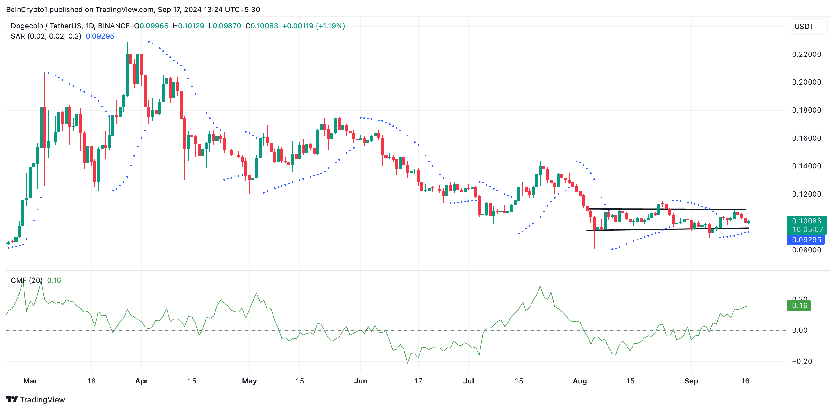 SponsoredNonostante l‘aumento dell’attività di acquisto nelle ultime sei settimane, come mostrato da indicatori chiave come il Chaikin Money Flow (CMF), che è in tendenza positiva da inizio settembre e si attesta a 0,16, segnalando un afflusso di liquidità nel mercato, DOGE ha superato la resistenza di 0,10 USD solo due volte.