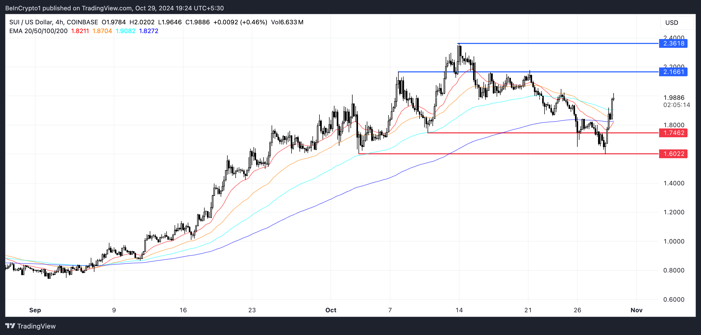 La resistenza immediata di SUI è a 2,16 USD. Se questo livello viene superato, il prezzo della moneta potrebbe continuare a salire fino a 2,36 USD, rappresentando un potenziale guadagno del 19,7%. Tuttavia, se la tendenza al rialzo non si stabilisce, SUI potrebbe affrontare una tendenza al ribasso e testare i livelli di supporto a 1,74 USD e possibilmente 1,60 USD.