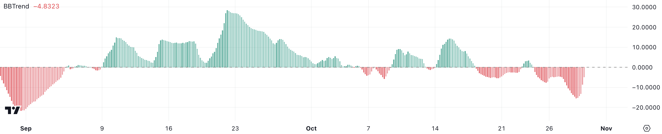 Il BBTrend di SUI è attualmente a -4,8. Il BBTrend, o tendenza delle Bande di Bollinger, misura la forza e la direzione di una tendenza dei prezzi basata sulle Bande di Bollinger.