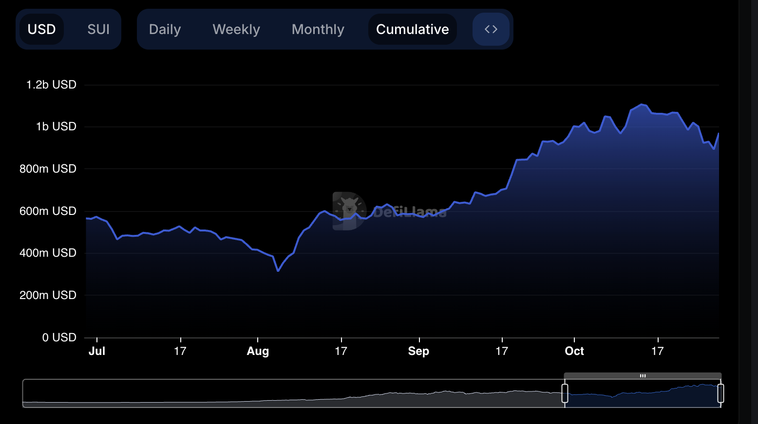 Monitorare il TVL è essenziale per comprendere la salute di un ecosistema blockchain. Un TVL più alto indica spesso una maggiore adozione, coinvolgimento degli utenti e liquidità. Il TVL di SUI ha raggiunto un record di 1,1 miliardi USD il 13 ottobre e è rimasto sopra 1 miliardo USD fino al 22 ottobre.