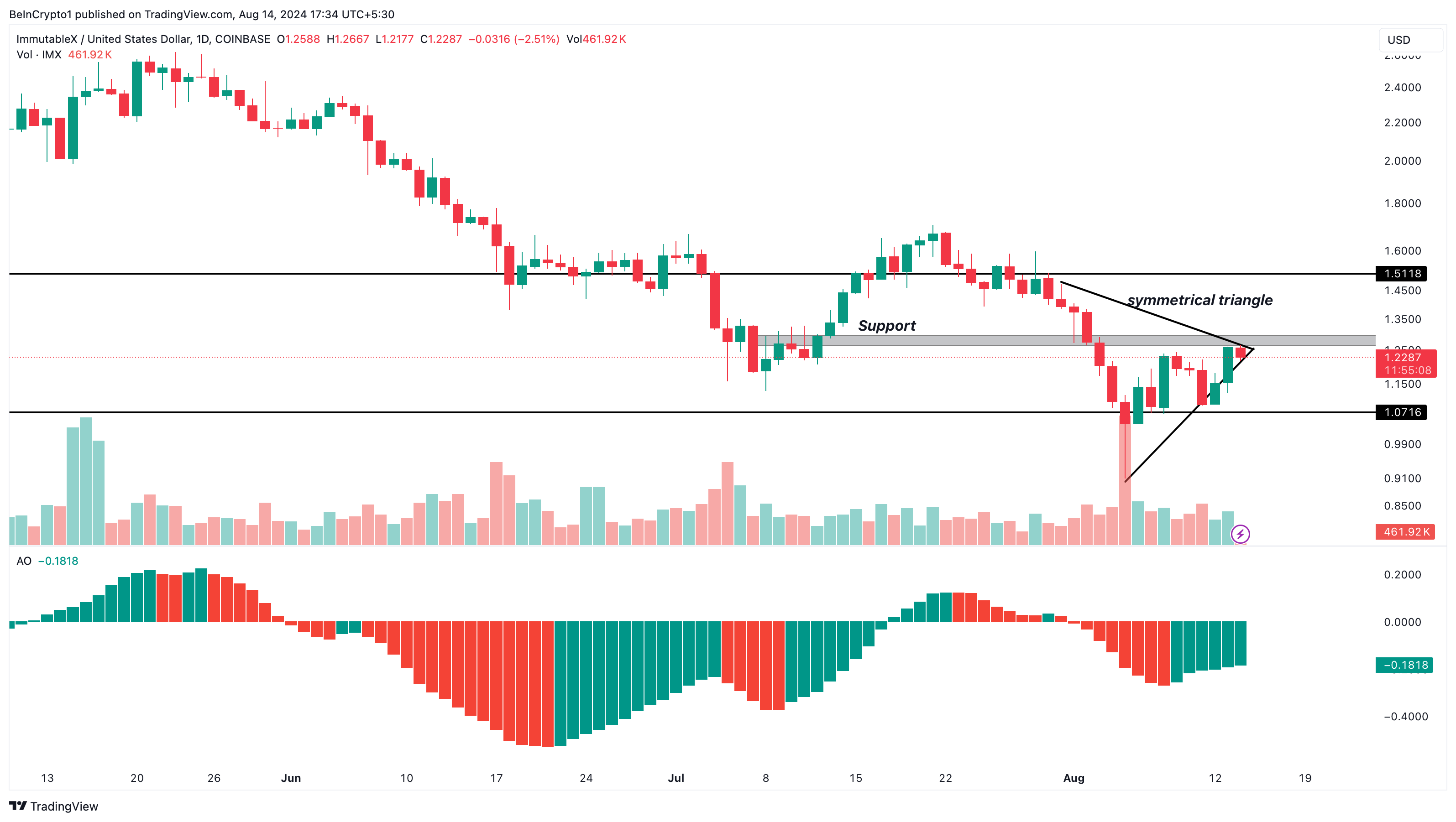 Secondo il grafico giornaliero, IMX si sta avvicinando a un precedente livello di supporto tra 1,26 e 1,30 dollari. L’ultima volta che il token ha raggiunto questa regione è stato il 21 luglio, con un aumento del prezzo a 1,70 dollari.
