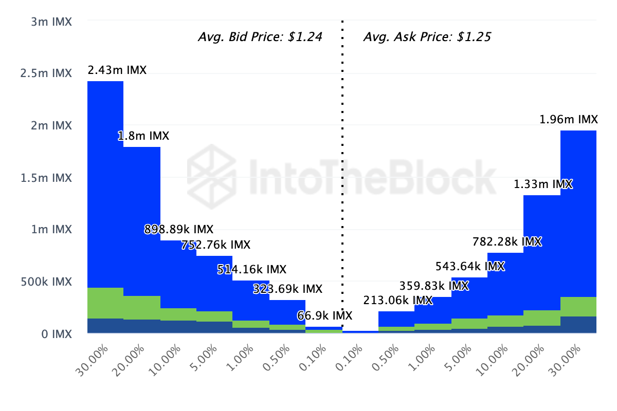 I dati forniti da IntoTheBlock mostrano che i partecipanti al mercato sono pronti ad acquistare quasi sette milioni di token IMX al prezzo attuale. D’altra parte, il numero di token in linea per essere venduti è di poco superiore a cinque milioni.