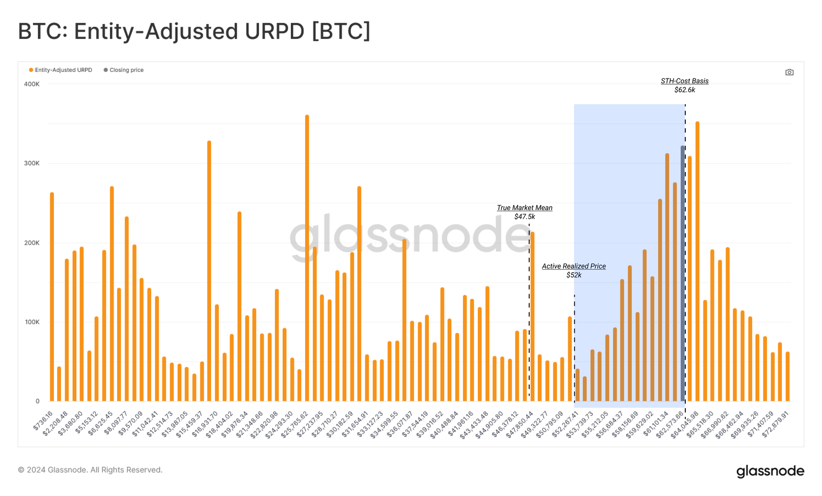 Secondo i dati di Glassnode, 62.600 USD è un livello chiave dove è stato scambiato un grande volume di BTC. Sotto questo prezzo, il supporto si indebolisce.
