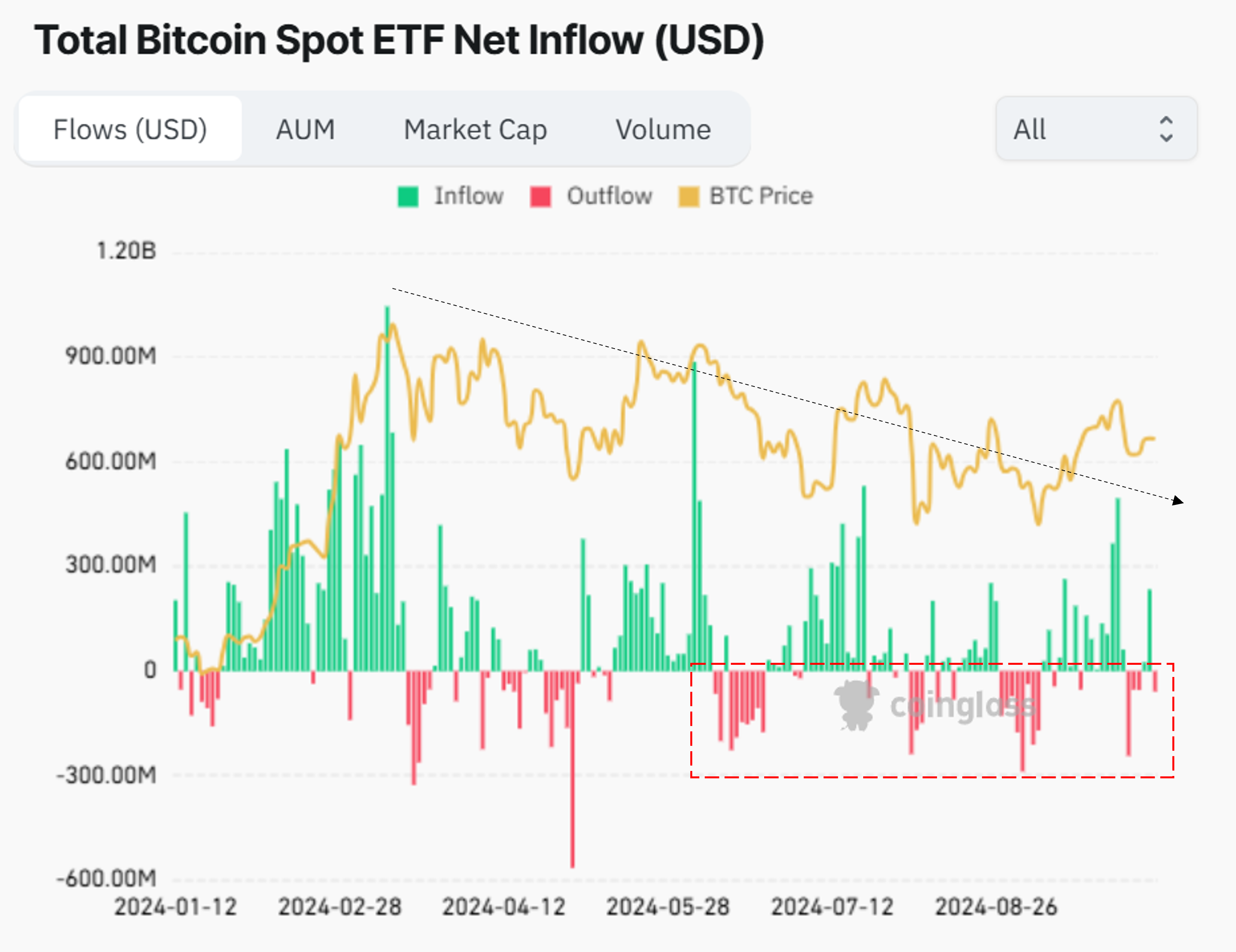 Un altro dato a sostegno dell’argomento che gli investitori statunitensi stanno vendendo è il deflusso netto dagli ETF su Bitcoin spot con base negli USA. Il grafico qui sotto mostra che gli afflussi negli ETF su Bitcoin sono diminuiti di recente e i loro asset sotto gestione (AUM) stanno rallentando nella crescita.