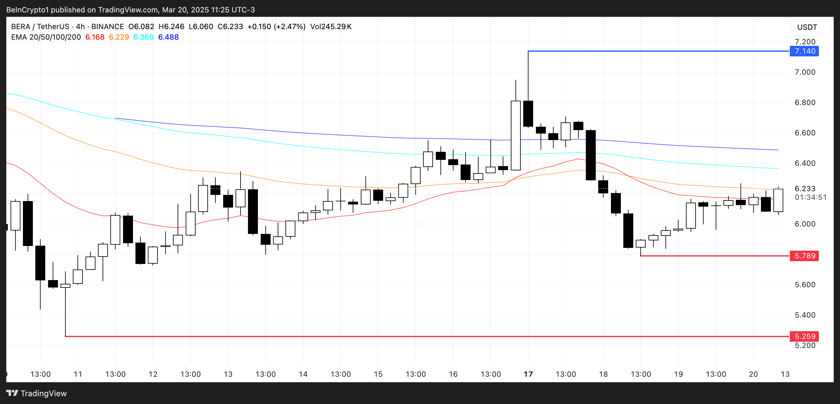 Le linee EMA di Berachain continuano a riflettere un setup ribassista, con le medie mobili a breve termine posizionate sotto quelle a lungo termine.