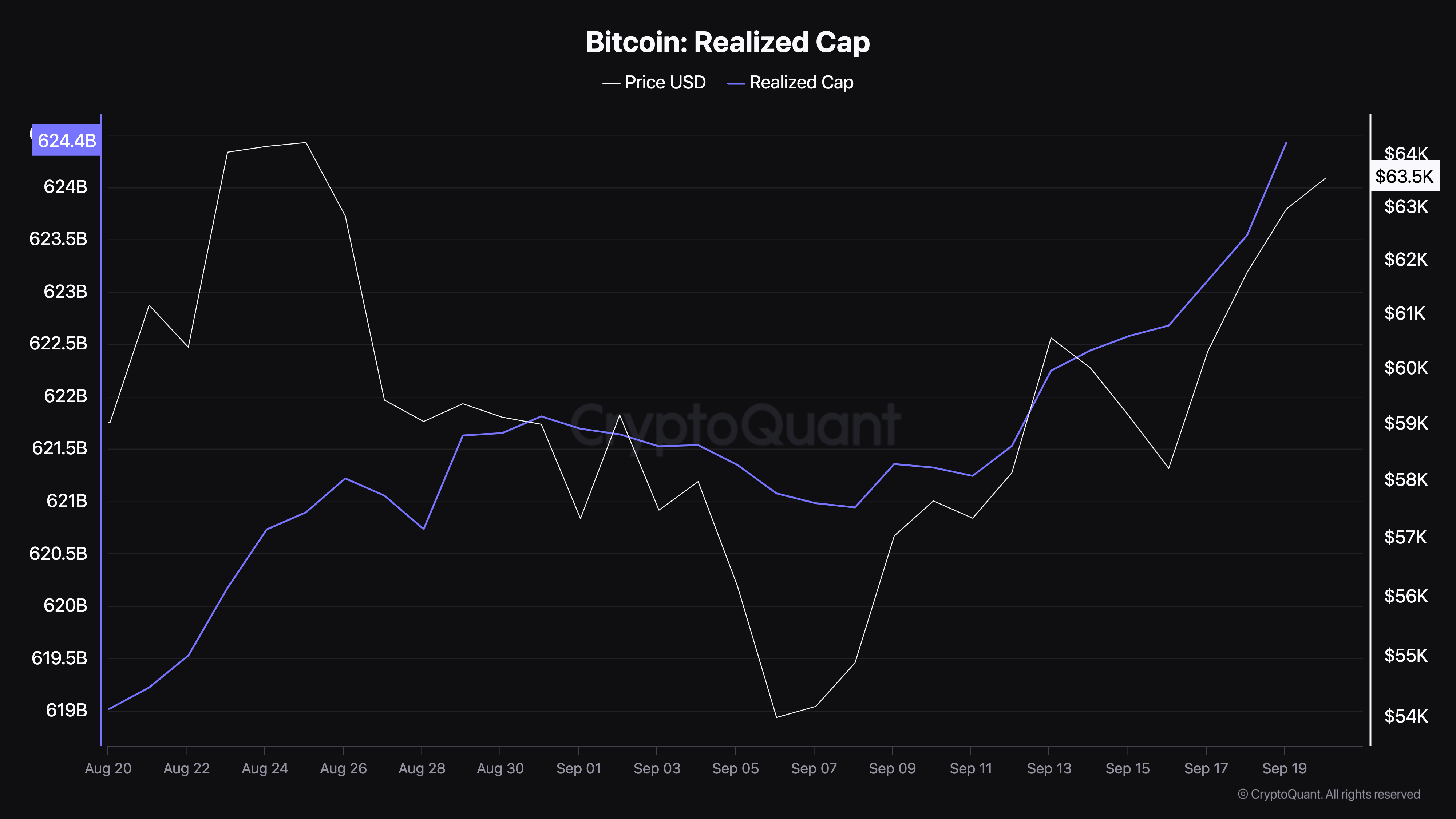 Il Realized Cap, d’altra parte, è di 624,24 miliardi di USD, come mostrato sopra. Questo indica che BTC è sottovalutato e che il prezzo ha il potenziale per salire ancora.