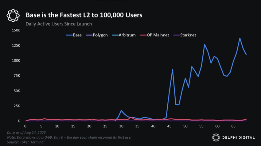 Base ha conquistato le prime pagine dei giornali il 24 agosto, quando è diventata la catena Layer-2 più veloce a raggiungere i 100.000 utenti. Secondo la piattaforma di analisi dei dati blockchain Delphi Digital, Base ha raggiunto il traguardo 56 giorni dopo il lancio della sua mainnet.