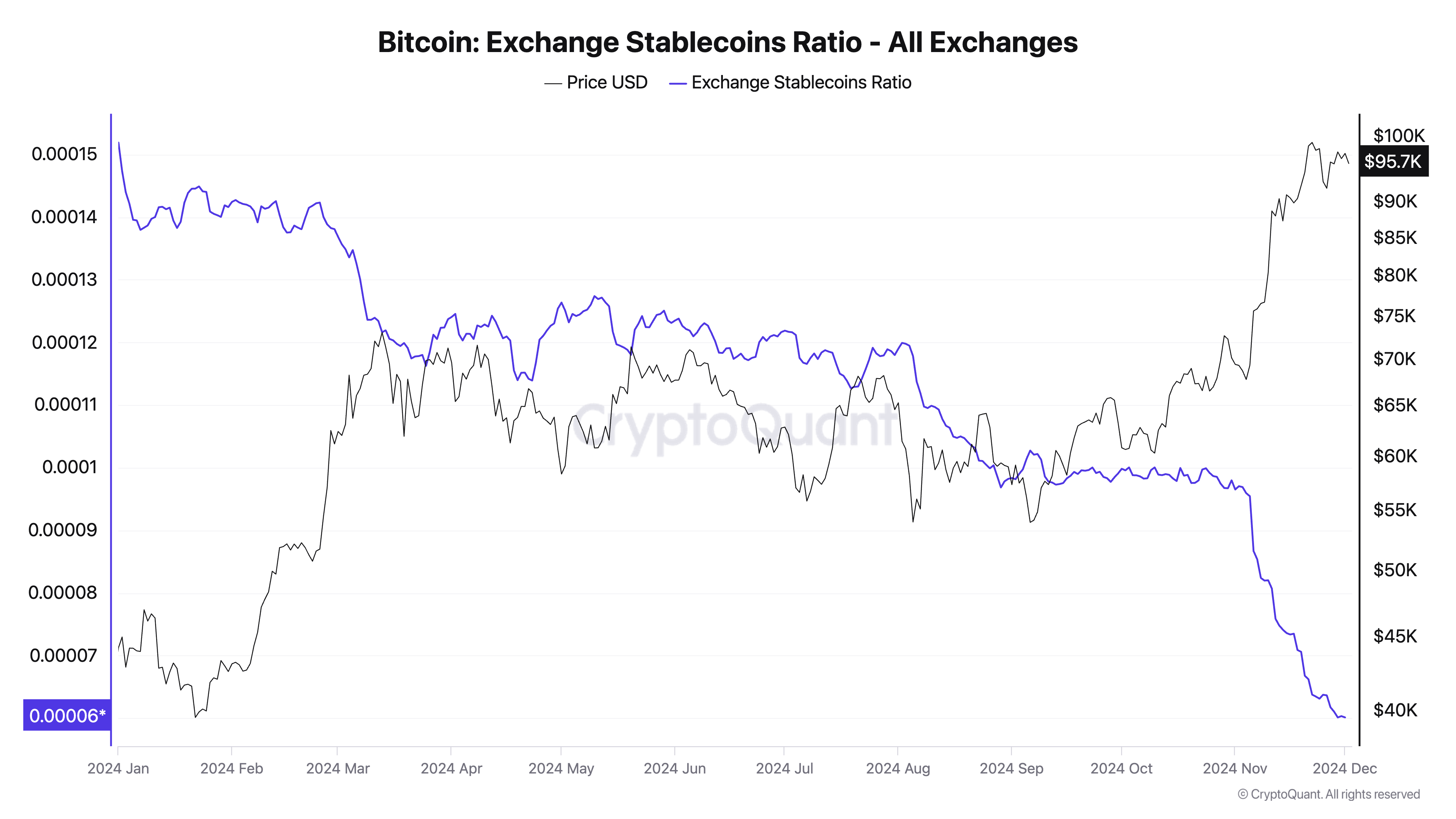 La valutazione di BeInCrypto della performance on-chain di BTC ha rivelato un calo costante del suo Exchange Stablecoins Ratio. Secondo i dati di CryptoQuant, questo si attesta a 0,000060 al momento della scrittura, il livello più basso dall’inizio dell’anno.